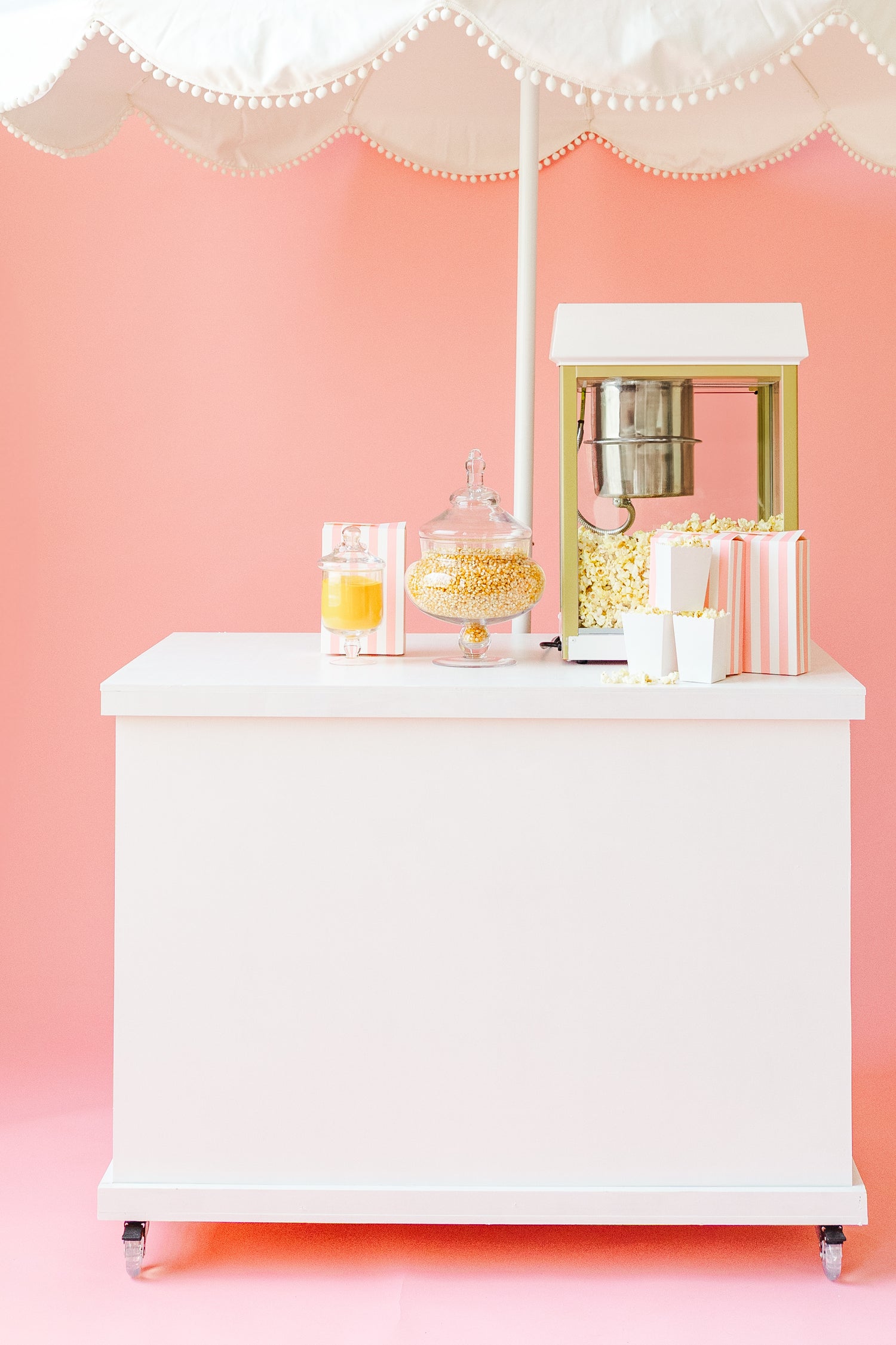 There is nothing better than the smell of freshly popped popcorn, just like at the movie theater! With our luxury popcorn cart, we pop it fresh to order and offer both sweet and savory toppings to make it even tastier!